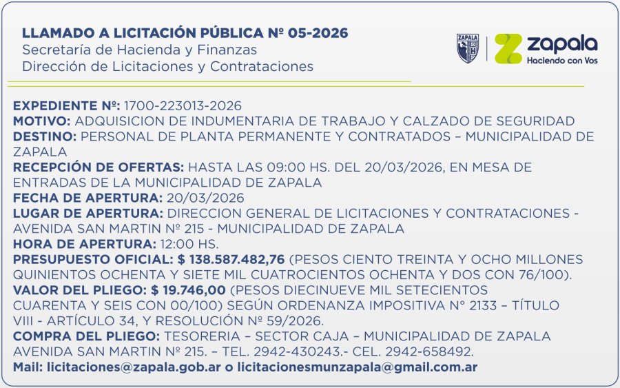 La Secretaría de Hacienda y Finanzas de la Municipalidad de Zapala lanzó el Llamado a Licitación Pública Nº 05/2026, a través de su Dirección de Licitaciones y Contrataciones, para la adquisición de indumentaria de trabajo y calzado de seguridad, el cual será destinado a personal de planta permanente y contratados.